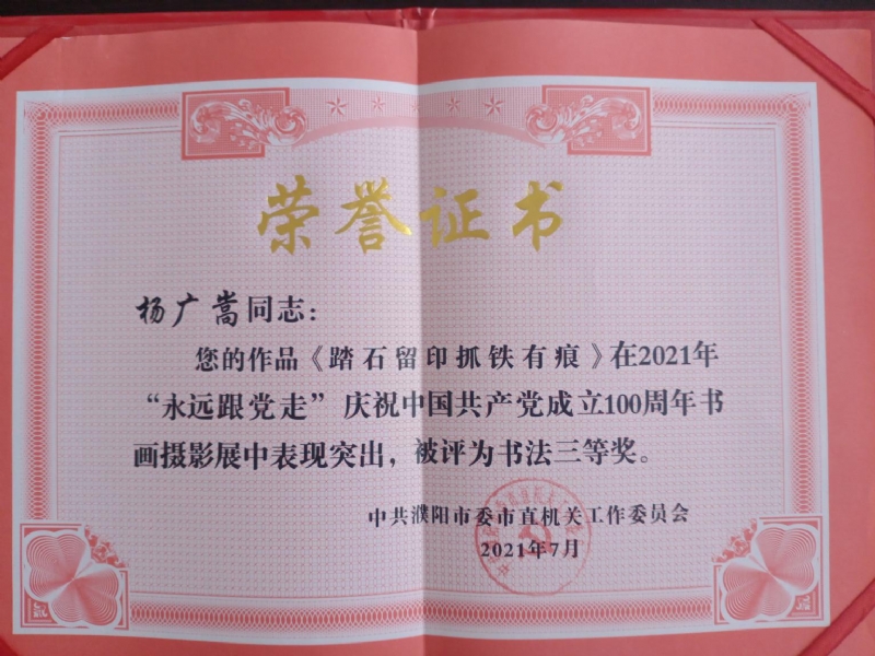 濮陽(yáng)城發(fā)投集團認真傳達學(xué)習文件精神,組織并鼓勵員工積極參與。集團公司員工踴躍報名,報送相關(guān)書(shū)法、攝影作品,經(jīng)過(guò)內部評選,推選出集團公司黨委委員、副總經(jīng)理楊廣嵩的書(shū)法作品《踏石留印 抓鐵有痕》代表集團公司參加活動(dòng)。