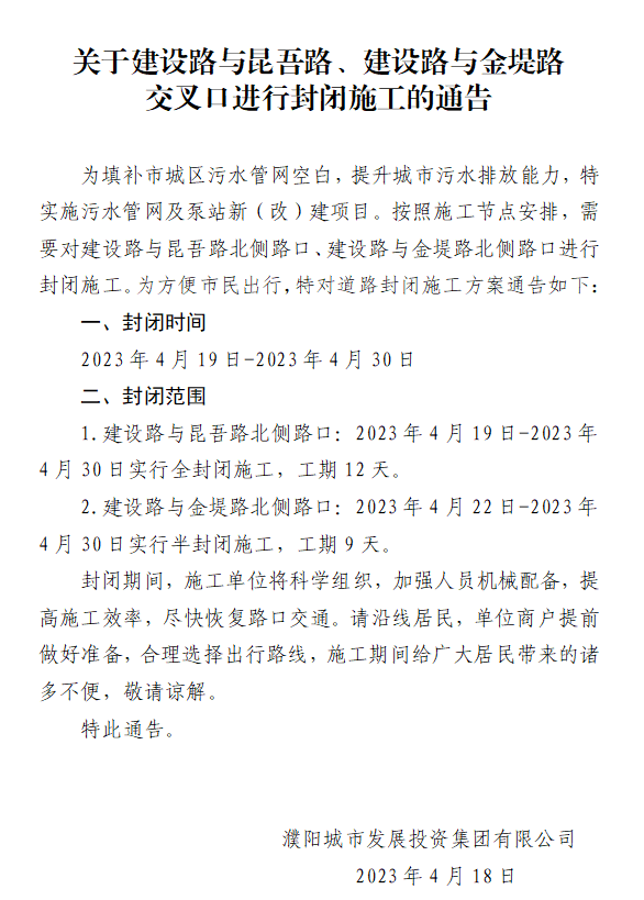 關(guān)于建設路與昆吾路、建設路與金堤路交叉口進(jìn)行封閉施工的通告