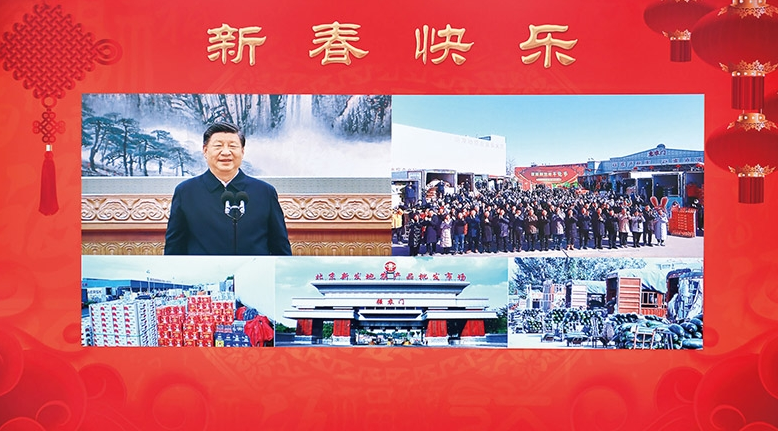 2023年1月18日,中共中央總書(shū)記、國家主席、中央軍委主席習近平在北京通過(guò)視頻連線(xiàn)看望慰問(wèn)基層干部群眾,向全國各族人民致以新春的美好祝福。這是習近平通過(guò)視頻連線(xiàn),同北京新發(fā)地農產(chǎn)品批發(fā)市場(chǎng)的商戶(hù)和采購年貨的群眾親切交流。新華社記者 李濤/攝