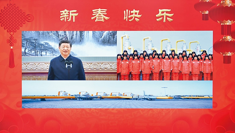 2023年1月18日,中共中央總書(shū)記、國家主席、中央軍委主席習近平在北京通過(guò)視頻連線(xiàn)看望慰問(wèn)基層干部群眾,向全國各族人民致以新春的美好祝福。這是習近平通過(guò)視頻連線(xiàn),同塔里木油田公司輪南油氣儲運中心西氣東輸第 一站克拉集氣區員工親切交流。新華社記者 李濤/攝