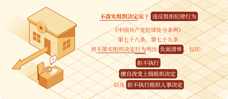 執行黨的決定,服從組織分配,積極完成黨的任務(wù)是黨員必須履行的義務(wù)。不落實(shí)組織決定屬于違反組織紀律行為?!吨袊伯a(chǎn)黨紀律處分條例》第七十八條、第七十九條對不落實(shí)組織決定行為列出負面清單,作出處分規定——