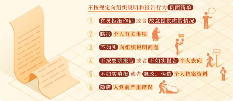 《中國共產(chǎn)黨紀律處分條例》第八十條、八十一條,對不按規定向組織說(shuō)明和報告行為作出了處分規定,主要包括6類(lèi):